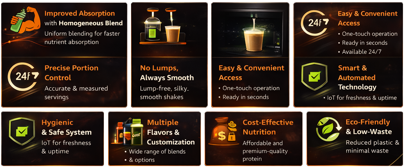 ProShake machines deliver high-demand protein shakes 24/7, helping gyms, offices, hospitals, and commercial spaces enhance customer experience while generating consistent passive income.